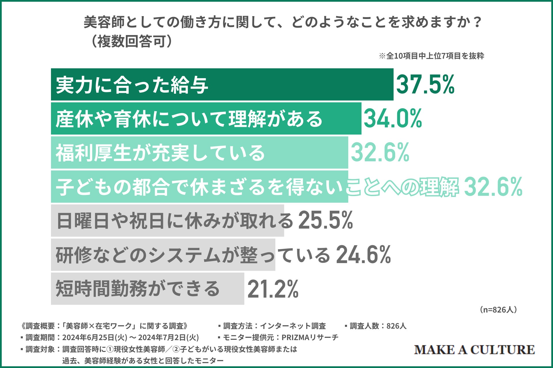 「美容師としての働き方に関して、どのようなことを求めますか?(複数回答可)」と質問したところ、『実力に合った給与(37.5%)』と回答した方が最も多く、次いで『産休や育休について理解がある(34.0%)』『福利厚生が充実している(32.6%)』『子どもの都合で休まざるを得ないことへの理解(32.6%)』となりました。