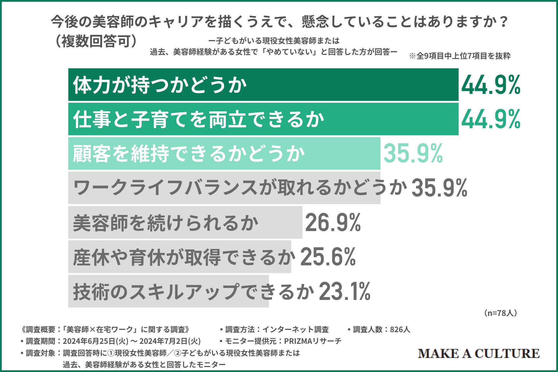 続いて、前述の質問で「やめていない(現在も現役)」と回答した方に、「今後の美容師のキャリアを描くうえで、懸念していることはありますか?(複数回答可)」と質問したところ、『体力が持つかどうか(44.9%)』『仕事と子育てを両立できるか(44.9%)』と回答した方が最も多く、『顧客を維持できるかどうか(35.9%)』と続きました。
