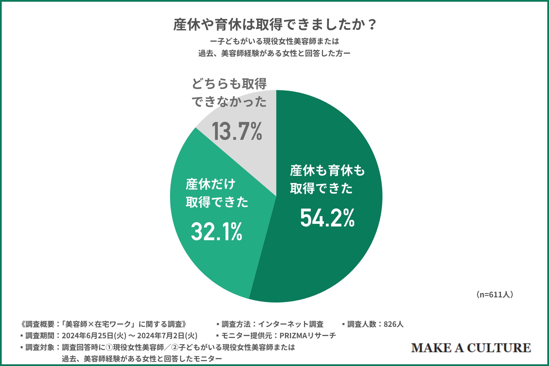 「産休や育休は取得できましたか?」と質問したところ、『産休も育休も取得できた(54.2%)』『産休だけ取得できた(32.1%)』『どちらも取得できなかった(13.7%)』という結果となりました。