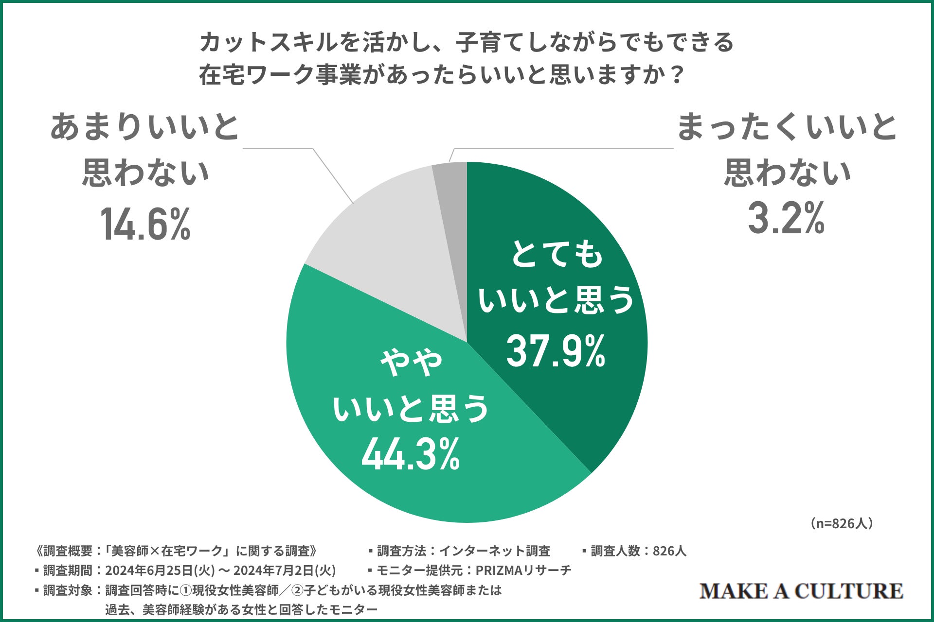 そこで、「カットスキルを活かし、子育てしながらでもできる在宅ワーク事業があったらいいと思いますか?」と質問したところ、『とてもいいと思う(37.9%)』『ややいいと思う(44.3%)』『あまりいいと思わない(14.6%)』『まったくいいと思わない(3.2%)』という結果となりました。