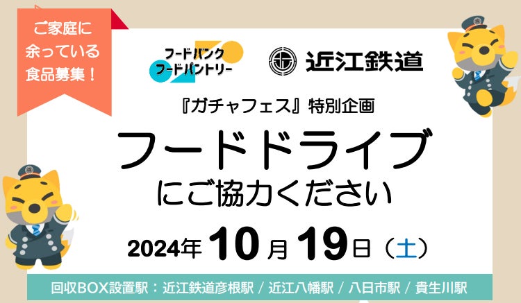 近江鉄道沿線で「食の輪」を広げることを目的として「フードドライブ」を実施します。「フードドライブ」とは、ご家庭で余った食品をフードバンク団体等に寄付する活動です。開催当日に近江鉄道線の4駅に回収ボックスを設置し、回収した食品は後日「フードバンクひこね」さまに寄付します。