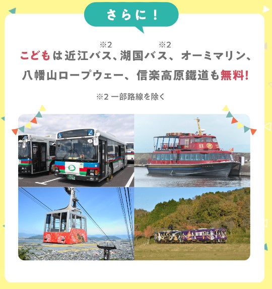 (3)近江バス・湖国バス(一部路線を除く)、八幡山ロープウェー、びわ湖観光船オーミマリン、信楽高原鐵道 こども(小学生以下)無料