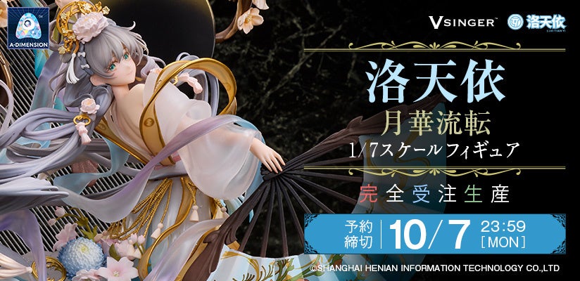 株式会社A・DIMENSION(A・ディメンション)(本社:東京都台東区、代表取締役社長:上村篤)は、『洛天依(ルオ・テンイ) 月華流転 1/7スケールフィギュア』の発売を決定し、予約受付を2024年7月1日(月)13:00より開始いたします。予約締切は、2024年10月7日(月)となります。本商品は、A・DIMENSIONが同日に公開する公式ECサイト『A・DIMENSION』(https://a-dim.com/)にてご予約が可能となります。