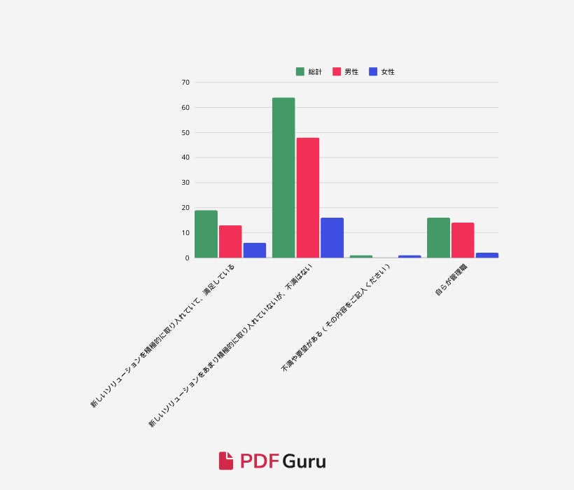 多くの回答者が中立的または無関心であったことは、彼らが現状維持の姿勢であることを示唆しています。これは、多くの職場でイノベーションが大きく欠如していることを示しており、従業員が新しい技術に対して挑戦を感じていないか、特に関心を持っていないことを示しています。伝統的な方法が深く根付いており、現代的なソリューションを採用する圧力がほとんどないことを表しています。