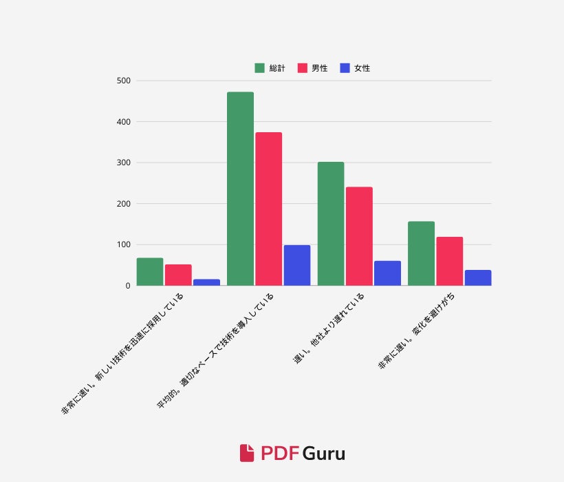 新しい技術を迅速に導入していると答えたのは約7%の回答者に過ぎません。大多数は採用速度を平均的と述べ、約46%は遅い、または非常に遅いと答えています。これは、技術導入の面で大きな改善が必要であることを示しています。