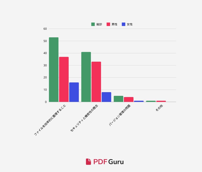 効率的な社内文書の整理は、50%以上の回答者にとって大きな課題となっています。デジタルストレージがこのプロセスを合理化できる可能性があるものの、多くの人々が依然として印刷された文書を管理しており、既存の紙の記録と併せてファイリングする必要があることを示しています。セキュリティと機密性に関する懸念も、デジタルおよび物理的な形式の両方で引き続き存在しています。興味深いことに、バージョン管理の問題を報告した回答者は10%未満であり、これは通常デジタル文書に関連する課題であることから、これもオフィス業務の大部分が依然として紙面で行われていることを示唆しています。
