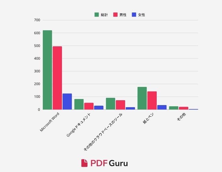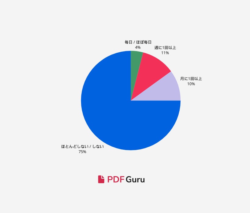Microsoft Wordは最も一般的なツールで、60%の回答者が文書作成に使用しています。しかし、18%は依然としてペンと紙を好んでおり、手作業のプロセスがデジタルツールと共存し続けていることを示しています。これはファイルのPDF変換が頻繁でない理由ともなっており、多くの職場で印刷物が好まれていることをさらに強調しています。