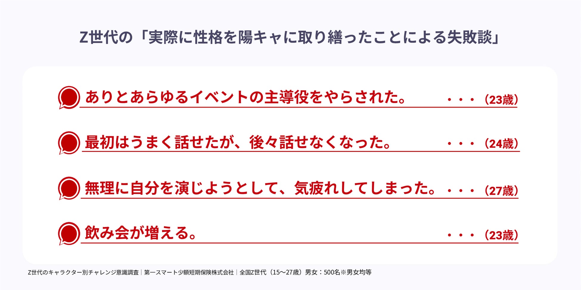 さらに、「実際に性格を陽キャに取り繕ったことによる失敗談」からも、自身を陽キャと演出することのリスクが垣間見られる結果となりました。
