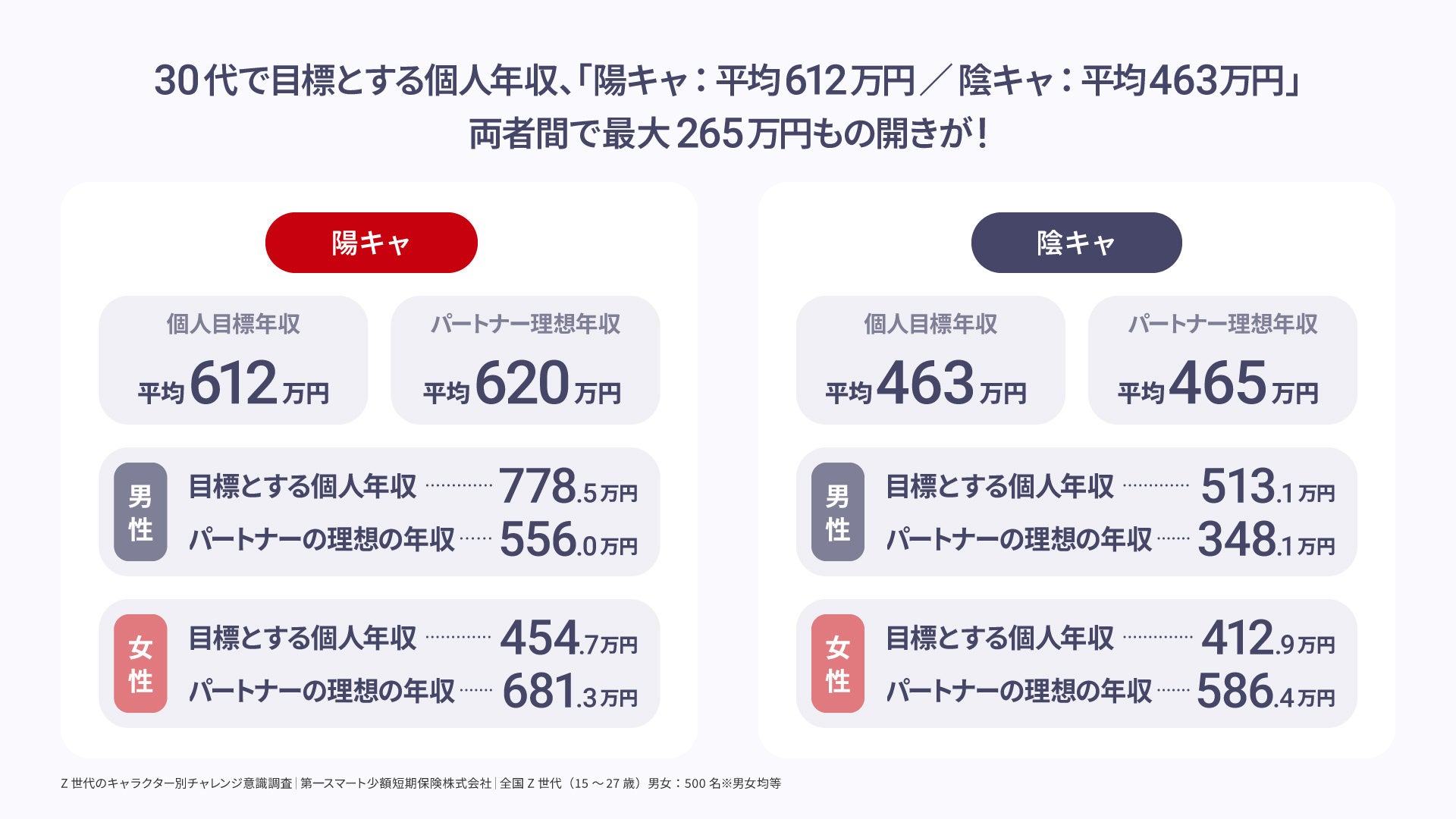 同じくキャラクター別に、『30代になった時に目標とする個人年収およびパートナーに求める年収』を伺ったところ、個人年収は「陽キャ:平均612万円/陰キャ:平均463万円」、パートナーに求める