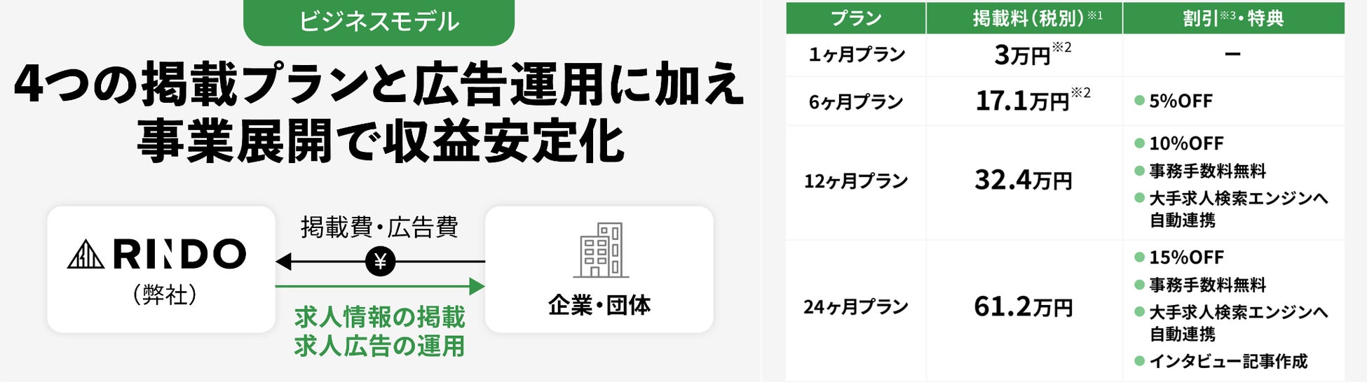 弊社の主な収益源はRINDOへの掲載費で、1、6、12、24ヶ月の4つの期間の掲載プランを設けています。