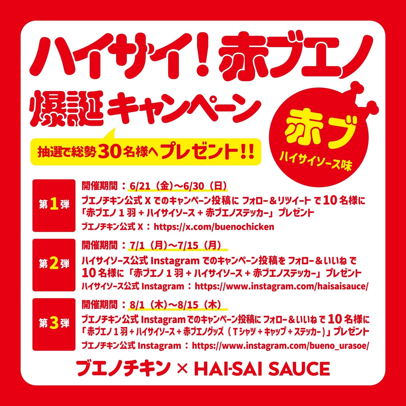 ブエノチキン公式X(https://x.com/buenochicken)を『フォロー』し、キャンペーン投稿を『リツイート』して頂いた方に「赤ブエノ1羽+ハイサイソース+赤ブエノステッカー」を抽選で10名様にプレゼントします。