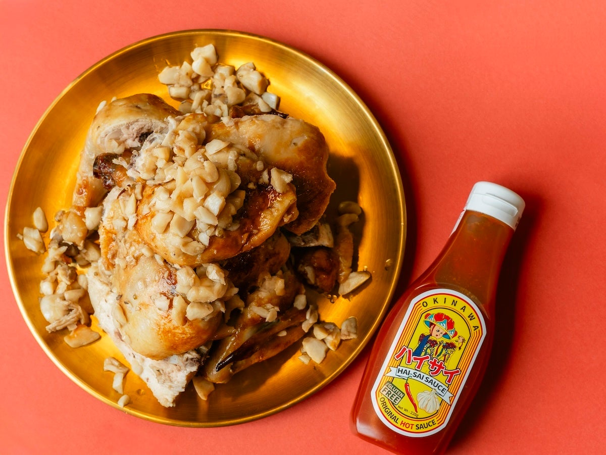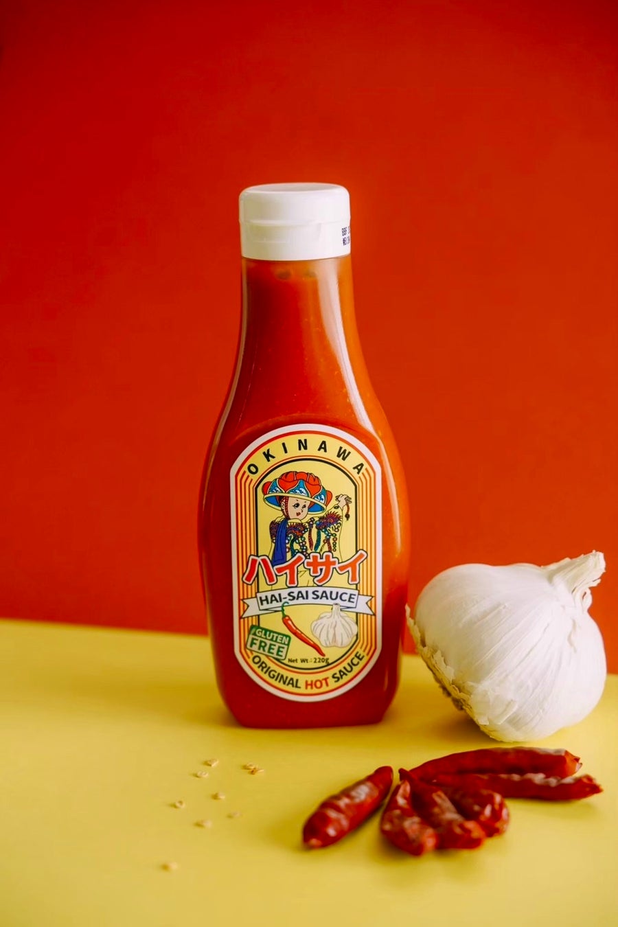 沖縄を飛び出した島人がタイで出会ったシラチャソースをベースに地元沖縄の人々の舌に合うようにブレンドしてできたソースがハイサイソースです。主な原料は唐辛子、ガーリック、砂糖、塩。スパイシーで程よい甘みとコクのある『旨辛』味に仕上げました。化学調味料不使用!しかもグルテンフリー!脂質0!