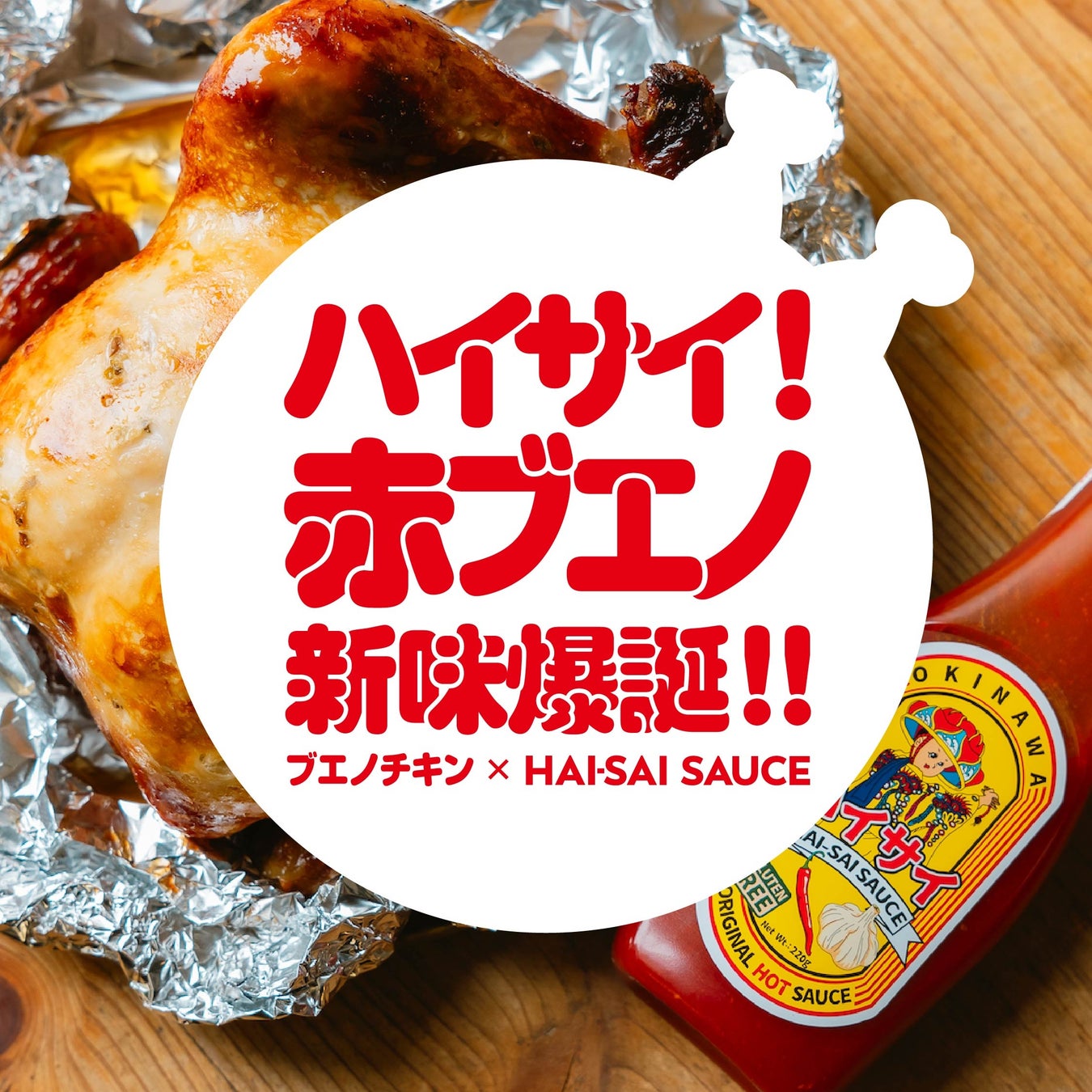 創業から42年目のブエノチキン歴史上、初となる新味・・それはハイサイソースさんコラボの旨辛!その名も「赤ブエノ-ハイサイソース味」。ブエノ秘伝のタレにハイサイソースを大量投入。ブエノスタッフも驚くでーじな旨辛味に仕上がりました。とはいえ、辛すぎないので社鳥ブエコの子供達もお気に入り!