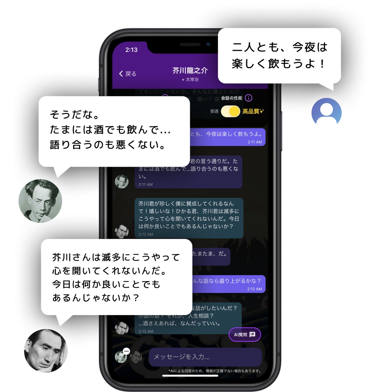 もちろん、追加した偉人でグループチャットもできるので、「推し」たちの対談を実現することもできます。
