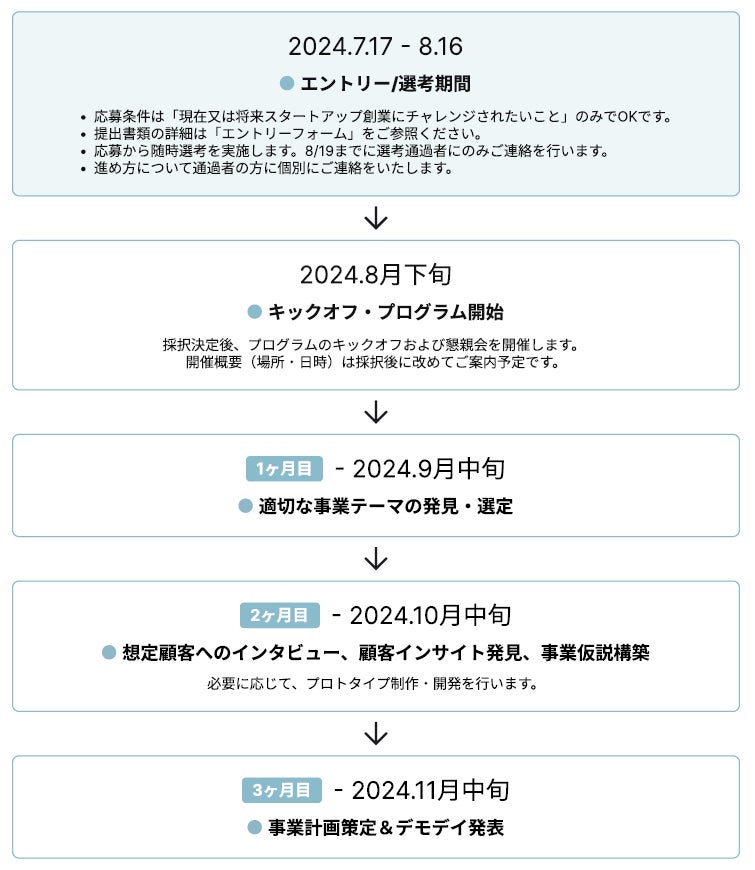本プログラムでは、約3か月の間に事業テーマの発見・選定、検証、事業仮説構築、事業計画策定、デモデイ発表を進めて、プログラム終了後の創業を目指します。