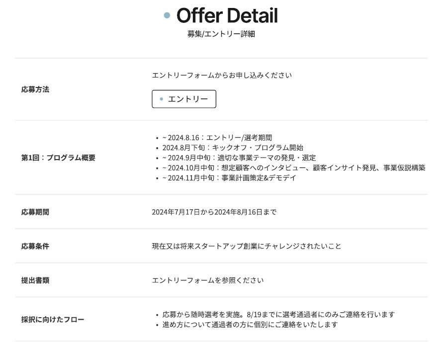 プログラム内では、当社が有望と考える事業テーマや切り口案のご提供に加えて、事業開発経験豊富なメンバー含む専門家との議論、検証を通じて、プロダクト開発、競争戦略の方向性(構造的な事業の勝ち筋)を定めるなど事業のブラッシュアップができます。