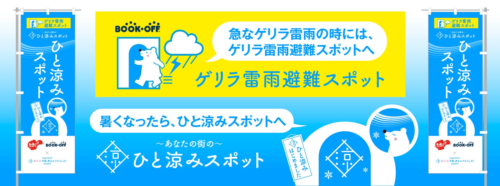 「ひと涼みスポット」兼「ゲリラ雷雨避難スポット」は、東京都と神奈川県にあるBOOKOFF71店舗にて9月10日~各店舗にて展開して参ります。是非お近くのBOOKOFFに掲載されている専用のぼりを見つけて、暑い時だけでなく突然のゲリラ雷雨の際にも避難して頂ければと思います。