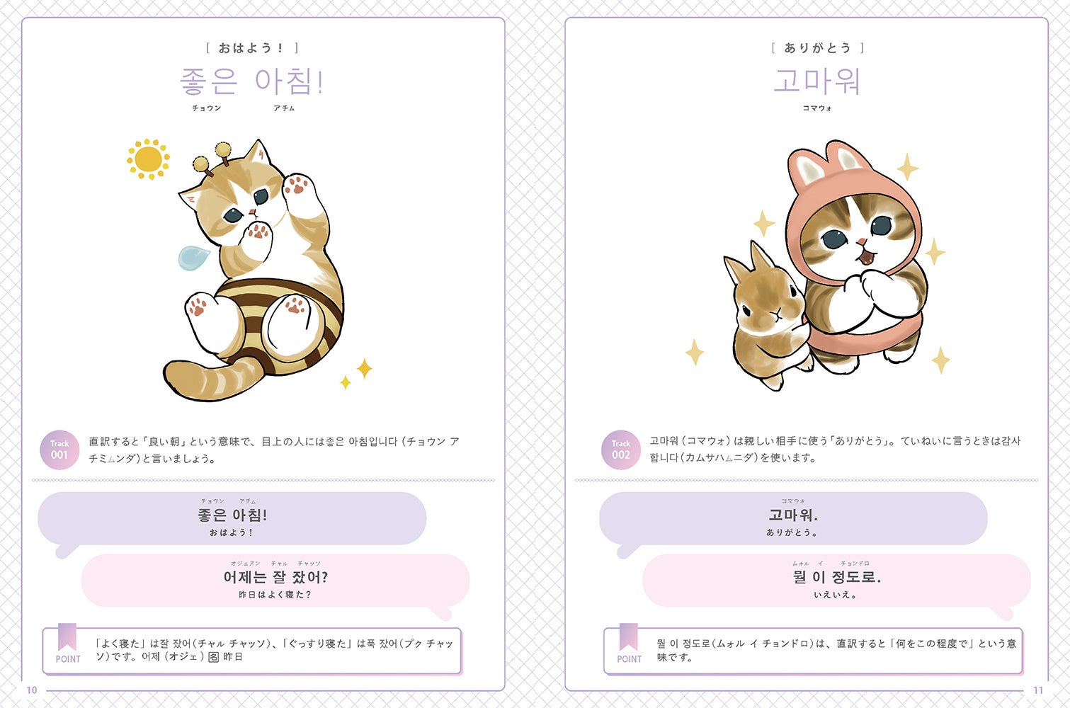 日常会話で使える約130の韓国語フレーズと、フレーズにリンクしたさまざまなにゃんこのイラストを掲載。かわいらしいにゃんこたちに癒されながら韓国語を学習できる1冊です。