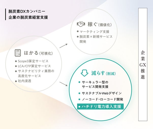 GXリテラシーと生成AIやローコード・ノーコードなどのモダンテクノロジーを使いこなすデジタルスキルを兼ね備えたGX人材が企業の現場で伴走し、脱炭素DX推進を支援。GX人材、LCAをもとにしたサービス・デザインチーム、脱炭素DXマーケティング、脱炭素DX人材育成、LCA算定支援などを提供しています。