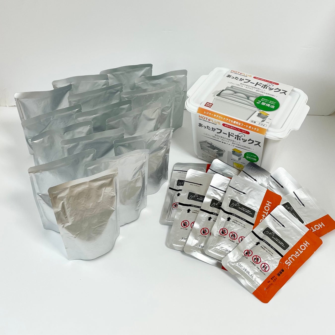 長期保存可能なレトルト食品と発熱剤、専用加熱容器をセットにした非常食のセットです。加熱に必要な水もセットにしていますので、どんな時でも温かい食事を用意することができます。専用容器内に発熱剤と食品とを一緒に入れられるので、必要なものがどこかに行ってしまうことを防ぎ、コンパクトにストックできます。