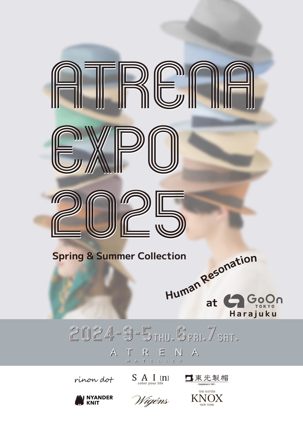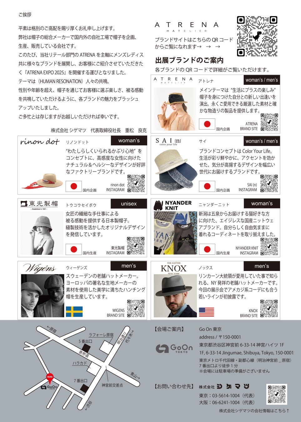 株式会社シゲマツは創業50周年を迎えた帽子の総合メーカーで国内外の自社工場にて帽子を企画、生産、販売している会社です。このたび弊社にて取り扱いしておりますATRENAをはじめとする様々な自社オリジナルブランド及びインポートブランドを、これまで以上にみなさまにより深く認知していただく為、原宿Go Onにて9月5日より3日間『ATRENA EXPO』を開催する運びとなりました。