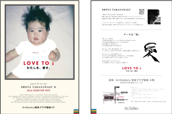 日本を拠点に、ReebokやNikeをはじめとした100作品以上のCMやMVを手がけてきたクリエイティブディレクター・髙柳 将太(株式会社Club50代表取締役)が、自身2回目の開催となる個展「LOVE TO i わたしを、愛せ。」をArtGallery 東急プラザ銀座にて開催。期間は本日2025年8月12日(火)〜8月24日(日)まで。「愛」をテーマに、さまざまなタッチの原画作品を展示する。