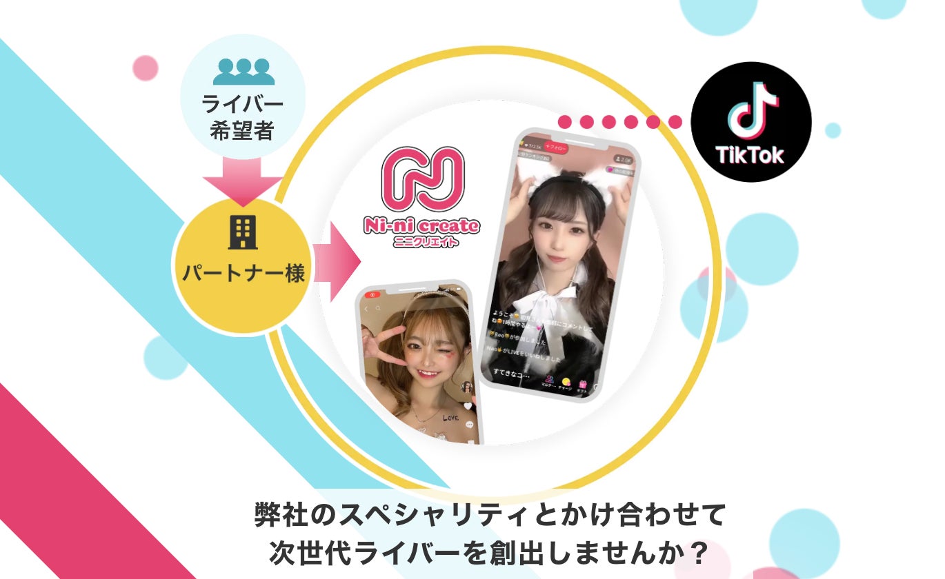 日本最大規模のTikTokクリエイタープロダクションNi-ni create(ニニクリエイト)が展開するライバーコネクションサービスは、コスト不要・ノーリスク! ノウハウ共有で未経験でも安心