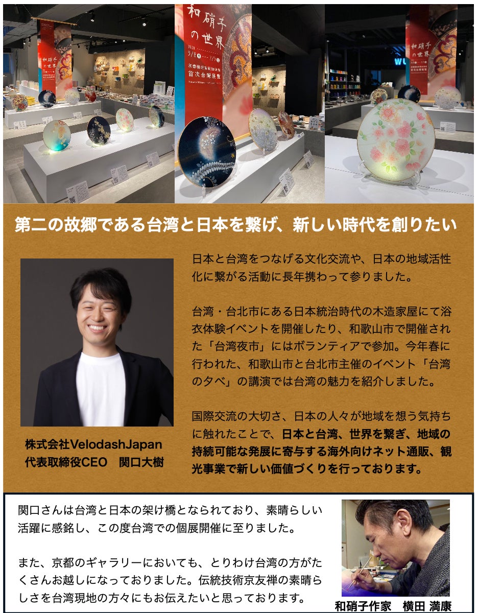 海外向けネット通販、インバウンド観光事業を行うスタートアップ企業 株式会社VelodashJapan(所在地:大阪市北区 代表:関口大樹)は、京都にて「和ガラス×着物アート」を制作する横田満康氏の作品を、台湾・台北市にて展示及びオンラインにて販売。