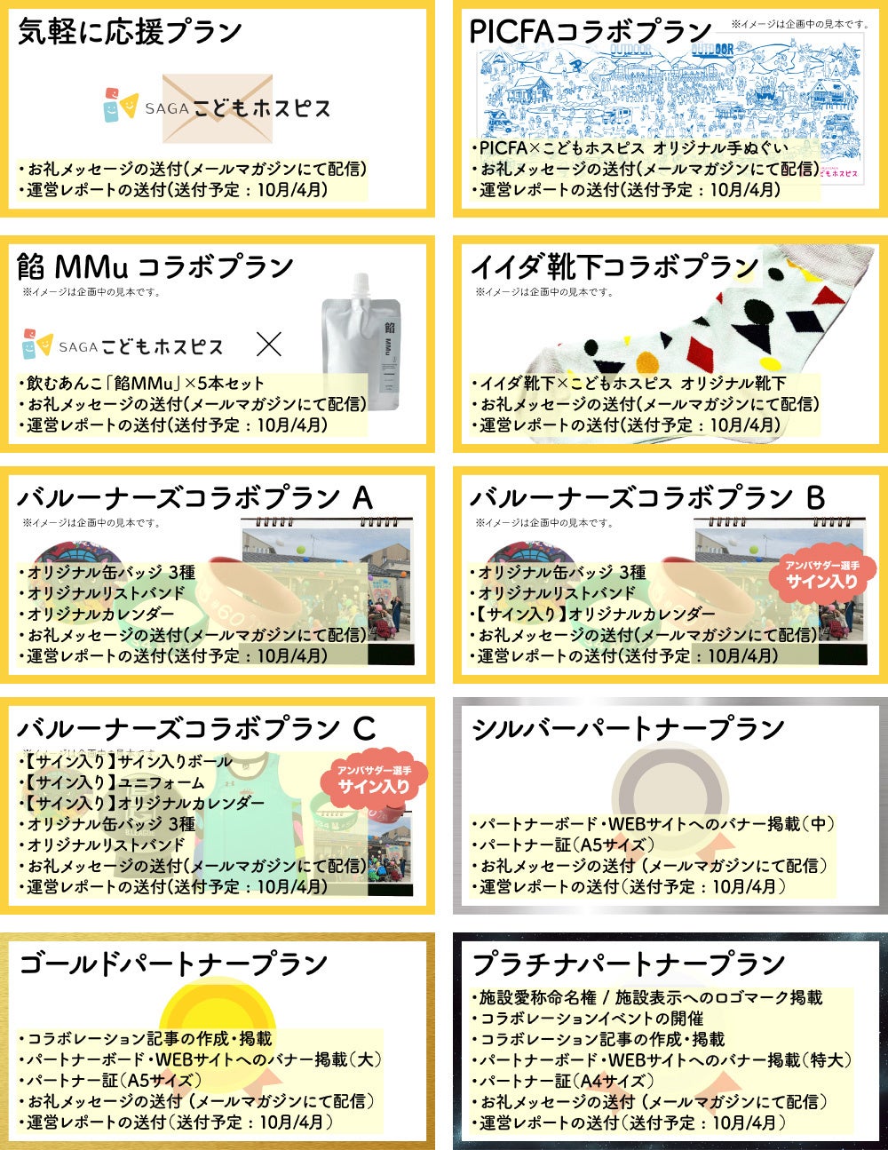 などと病気や障がいのある方とのコラボレーション作品、佐賀バルーナーズとのコラボプラン(サイン入りグッズやこどもホスピスとのコラボグッズなど)、法人プランなど