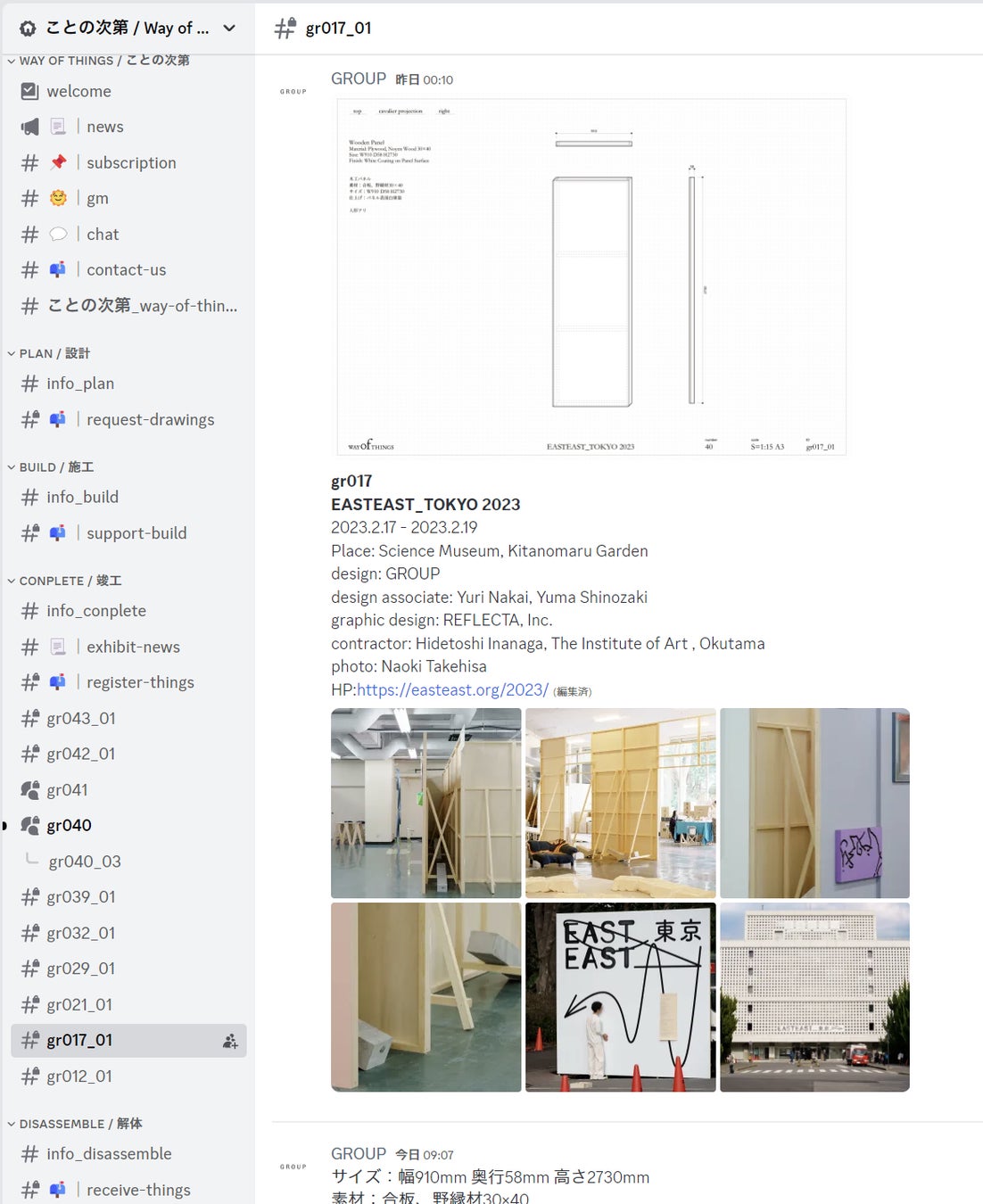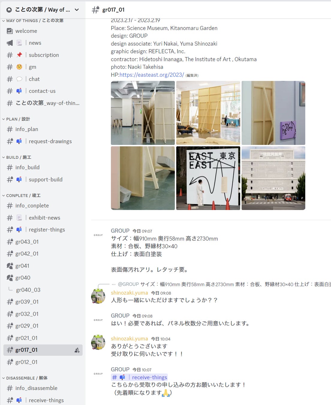 Discord 「ことの次第 / Way of Things 」は「こと」(=建築/空間/場所に用いられる材料や部品)の情報を共有し、引き継ぐためのサブスクリプション型プラットフォームです。サブスクリプションに登録すると、「こと」が今までどのような用途で使われてきたかの履歴情報や建築や展示の設計プロセス、図面を確認することができるほか、解体を待つ「こと」の引き取りを申出/相談することが可能です。交渉成立後、無償で引き取ることができます。またDiscordサーバー内の「設計」「施工」「竣工」「解体」の4つのカテゴリでは、それぞれのフェーズに応じた情報を公開します。各フェーズに応じたサービスを受けることができます。