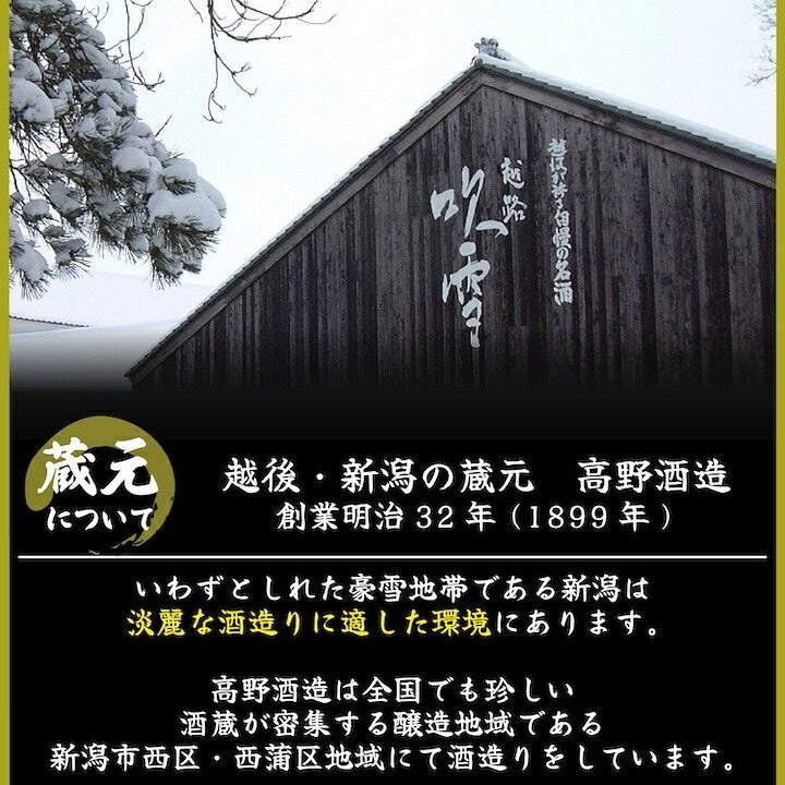 高野酒造株式会社は、1899年に創業以来、脈々と受け継がれる伝統的な酒造りを続けています。近隣には、日本で10番目にラムサール条約に登録された湿地「佐潟」があり、一年を通して水鳥が飛び交う自然環境豊かな新潟の地で酒造りをしております。