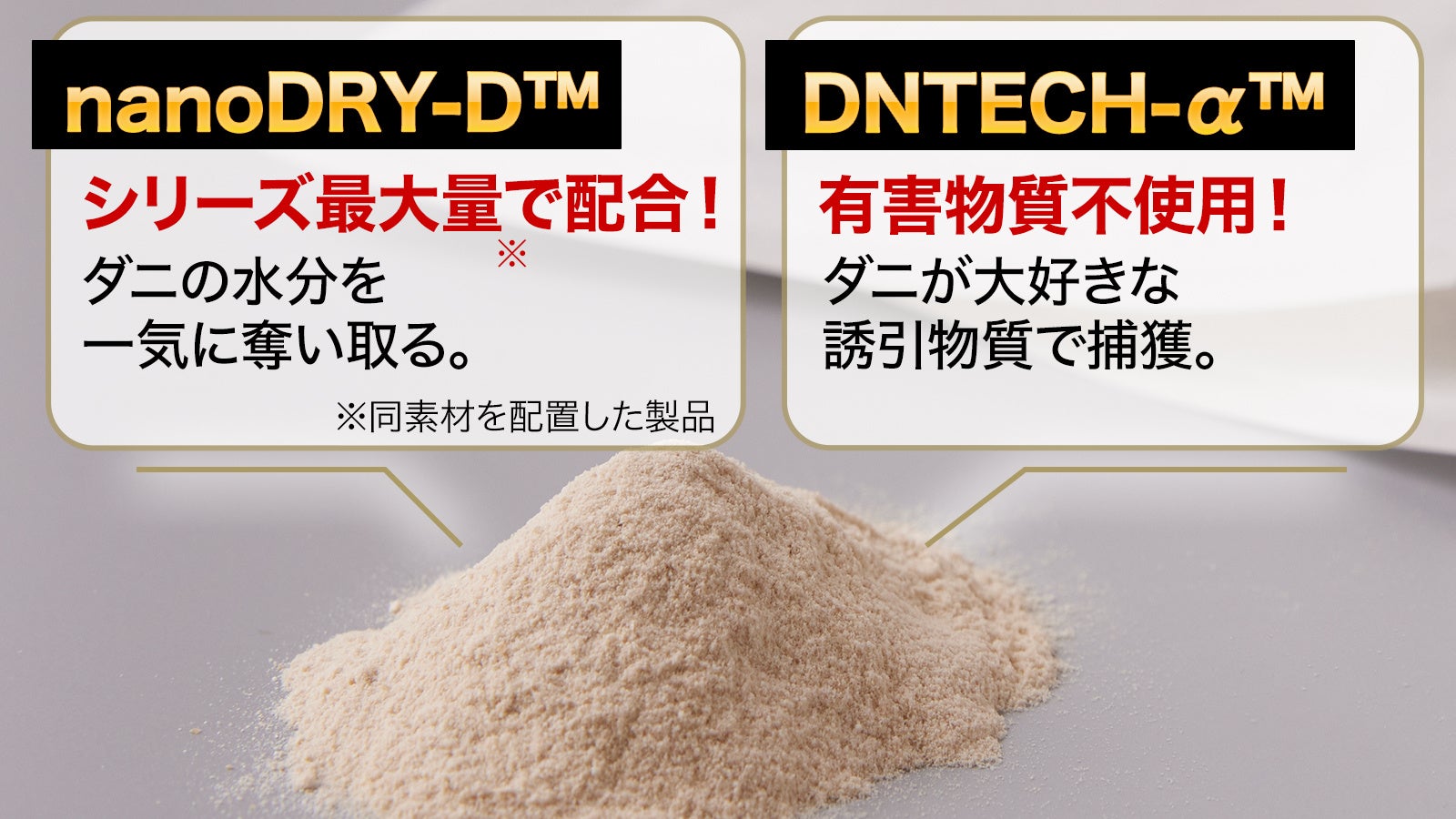 そこで着目したのが、ダニの体の80%を占める水分。研究の結果、乾燥させてしまえばダニは活動することができなくなることが判明しました。さらに試行錯誤を重ね、たった2日で乾燥・弱体化させることのできる乾燥剤「nanoDRY-D™」を開発。第三者機関によるダニ這い出し試験では、4週間経ってもシートから1匹も出てこないことが確認されました。