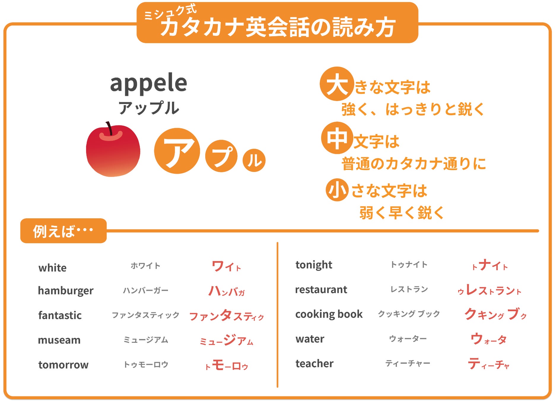 【英単語の読み方が、大中小、3つの大きさのカタカナで表示されている】