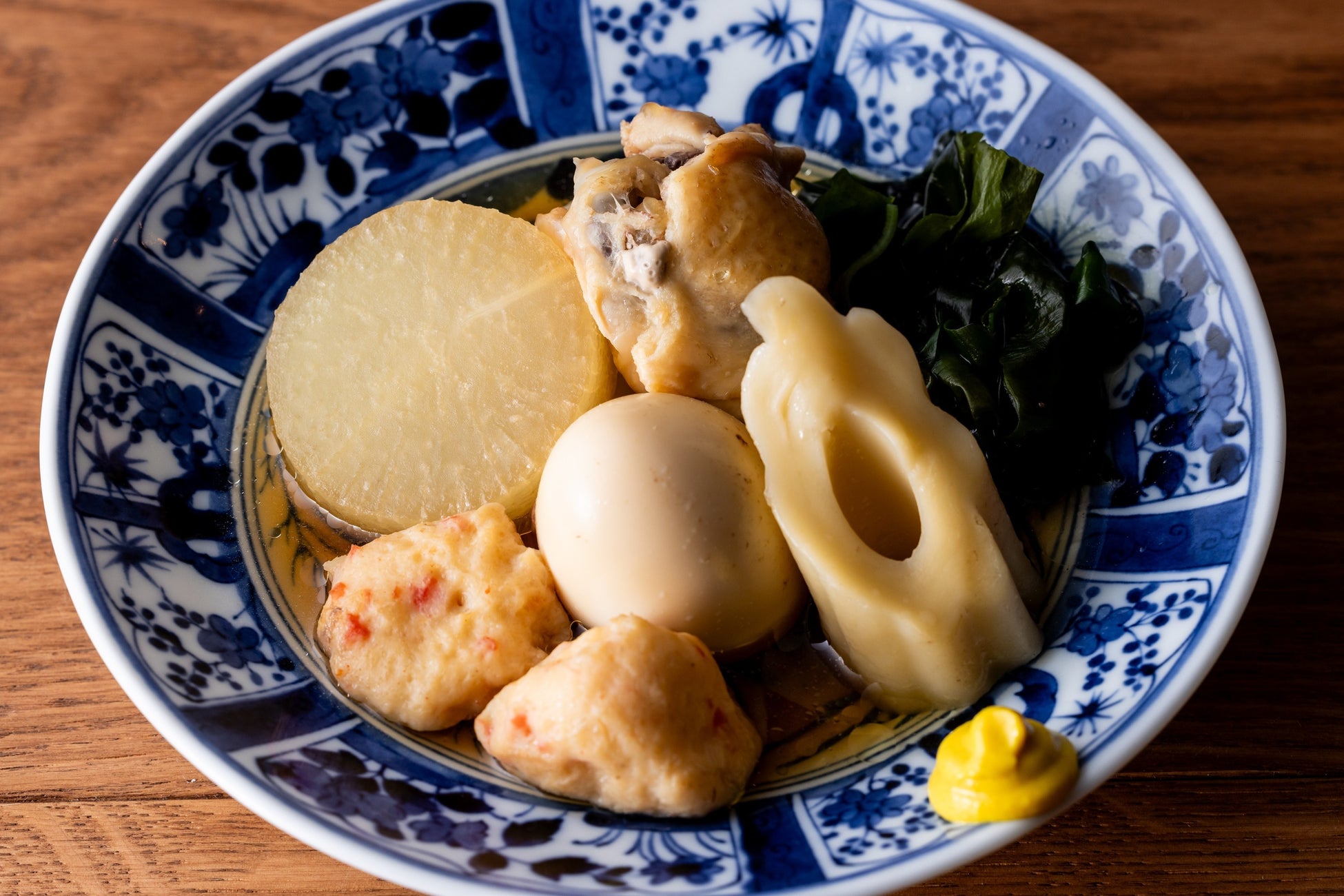 こだわりのブレンド蕎麦出汁で楽しむ、おでんの盛り合わせ。季節に合うラインナップを取り揃えます。