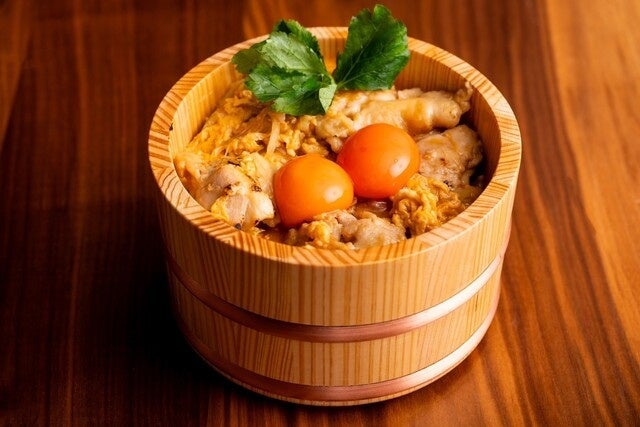蕎麦のかえしで作った親子丼を桶に盛りました。2つ乗った卵黄を絡めると、まろやかで、優しい味わいになります。