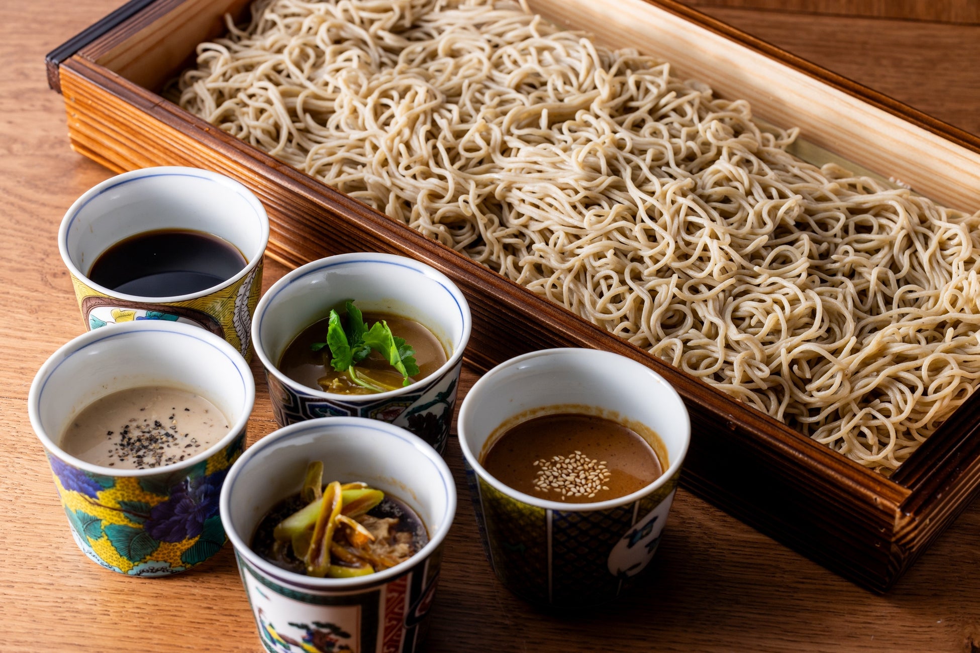 蕎麦は、国産の中でも特に風味豊かな蕎麦粉を厳選した二八蕎麦。そばつゆは、ファンの多い姉妹店『十割そば天ぷら 相馬庵』と同じく、高級みりん・国産ザラメ・数種類の醤油などをじっくり寝かせた「かえし」と、鯖節・鰹節・カタクチイワシなどのブレンド出汁で、蕎麦の旨さをさらに引き立てます。つけ蕎麦や温蕎麦それぞれに最適な味わいを実現しています。また、看板メニューの「囲み蕎麦」では、スタンダードなそばつゆに加え、「ポルチーニつゆ」や「胡麻坦々つゆ」などの変わりつゆも取り揃え、蕎麦の新たな楽しみ方を提案しています。定番のつゆと創作つゆの食べ比べも一興という、〆まで趣向のあるひとときを提供します。