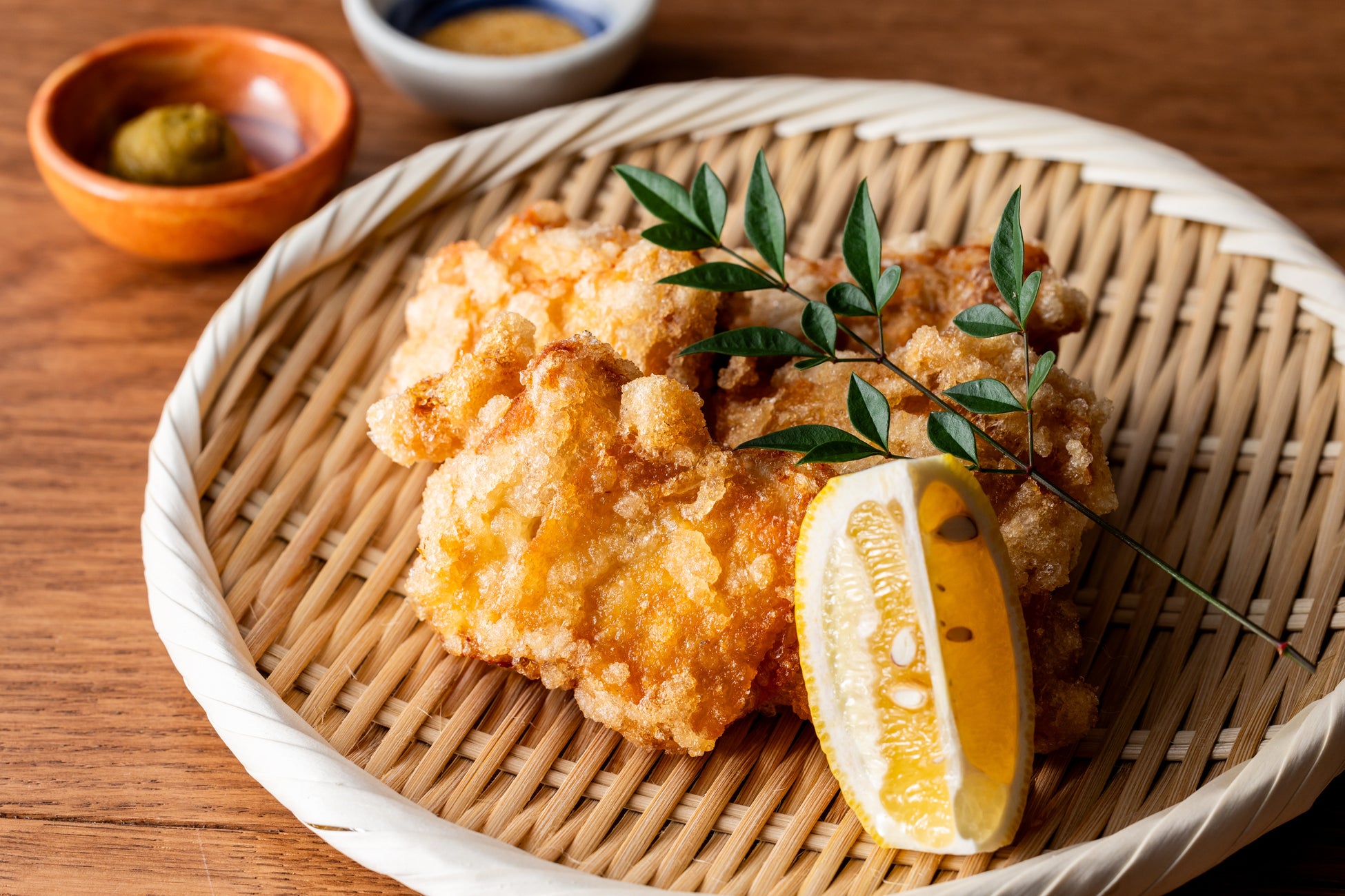 蕎麦の出汁に漬け込んで揚げた大きめのから揚げ。外はサクサク、中はジューシー!