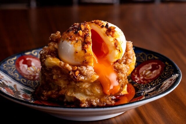 国産赤鶏(南部どり)を特製ネギ塩ダレで和えました。極上赤卵と天かすをトッピングした濃厚な味わい。