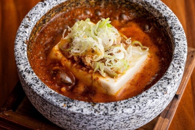 鶏の挽肉で作ったお酒がすすむピリ辛麻婆豆腐。熱々の石窯で提供します。