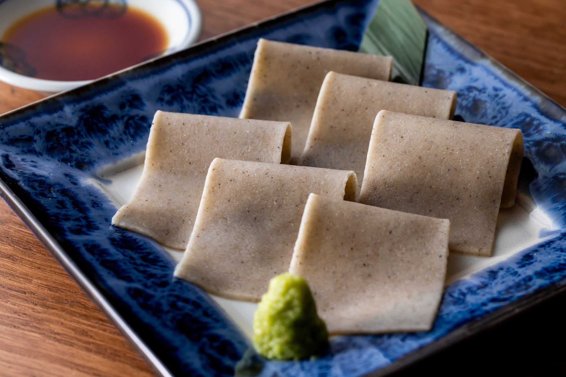 幅広に切り、ゆでた蕎麦はシンプルに蕎麦の風味を楽しめます。素材の味を活かす紅彩塩でどうぞ。
