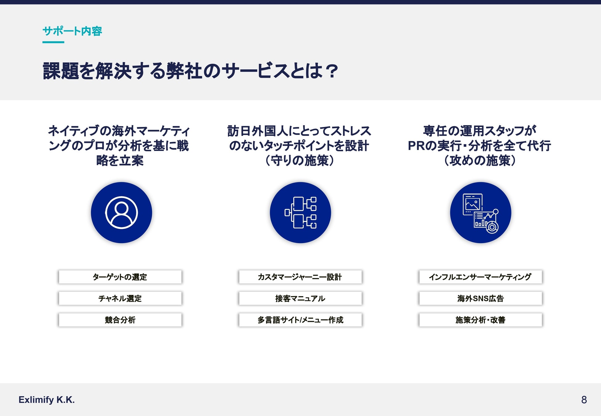Exlimify株式会社(エクスリミファイ)は、グローバル市場で豊富な実績を持ち、日本企業の海外進出および海外企業の日本市場参入を支援しています。その一環として、インバウンド訪日観光客を対象にした多言語対応のマーケティング戦略を提供し、企業や店舗の売上向上を支援しています。