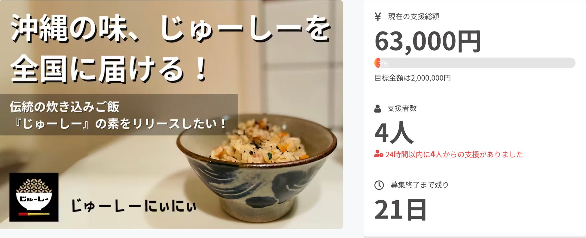 CAMPFIRE 「沖縄の味、伝統の炊き込みご飯 『じゅーしー』の素をリリースしたい!」