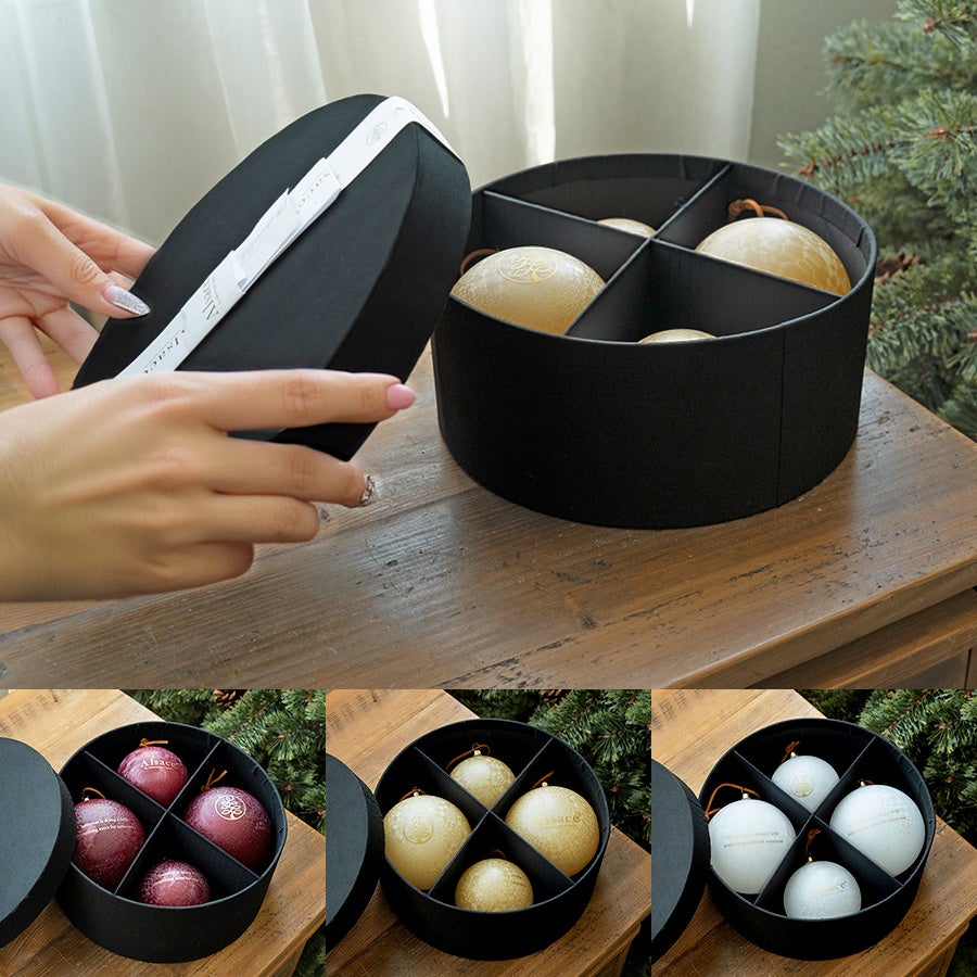 お洒落なアルザスのロゴと心温まるクリスマスのメッセージがデザインされている2種類のオーナメントが2つずつ、計4つのセットになった商品です。カラーはワインレッド・シャンパンゴールド・ホワイトの3色展開。どれも、そっと上品にツリーを彩ります。