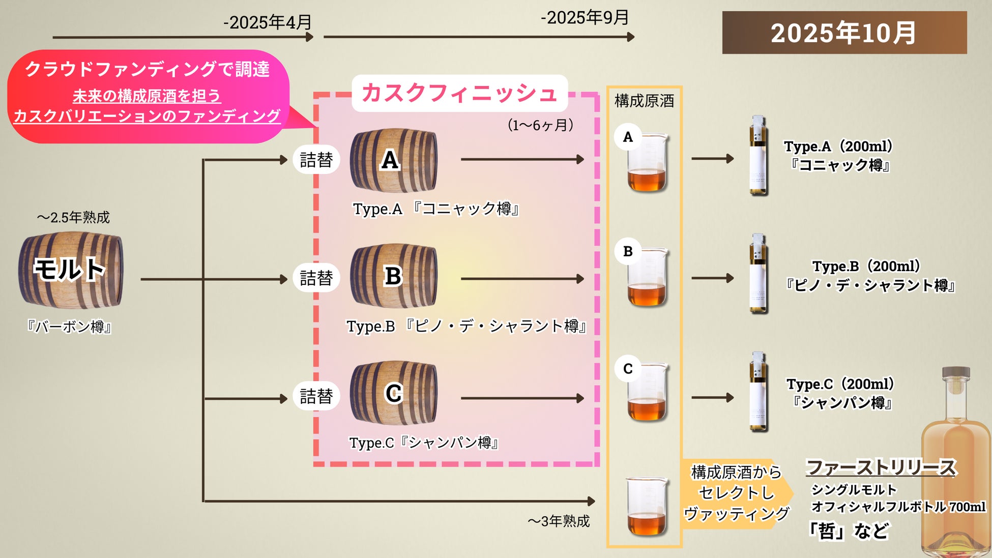 このたび、「日光街道小山蒸溜所」より、クラウドファンディング限定で特別な樽での仕上げで個性を付与(カスクフィニッシュ)した、「3年熟成ウイスキー」をリリースいたします。(2025年10月以降出荷予定)