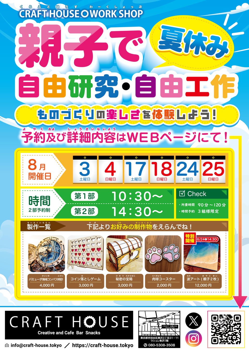 CRAFT HOUSE(東京世田谷区奥沢3丁目)は、2024年8月3日(土)より『夏休み親子で自由研究・自由工作ワークショップ』を開催します。