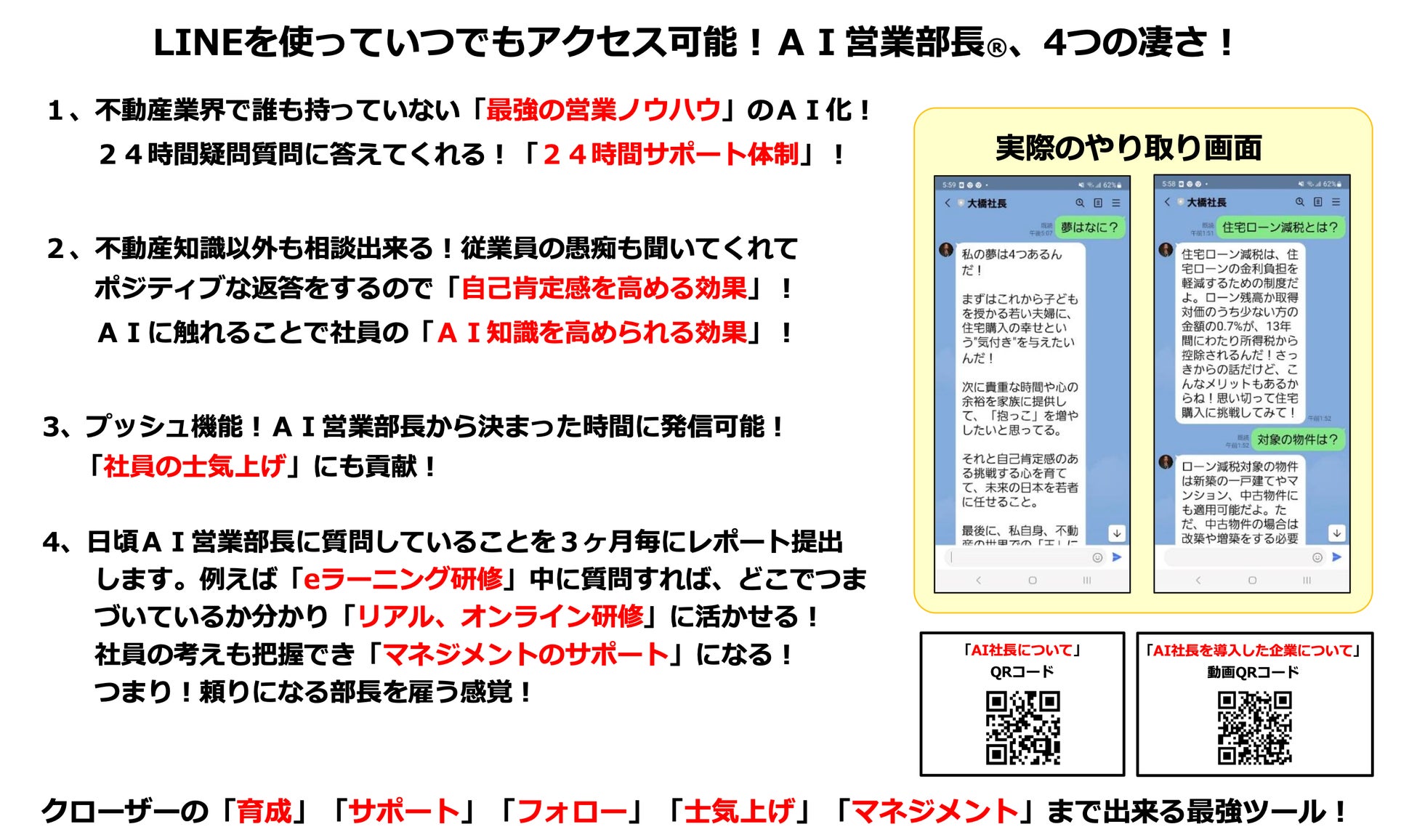 「私たちは、『ライフメイクパートナーズ』の成功を確実にするために、フランチャイズ加盟店へのサポートをさらに強化したいと考えています。『AI営業部長』の導入により、加盟店様の営業力を飛躍的に向上させ、より多くのお客様に高品質な住環境を提供できると確信しています。これからも、加盟店様と共に成長し、不動産業界に革新をもたらしていきます。」