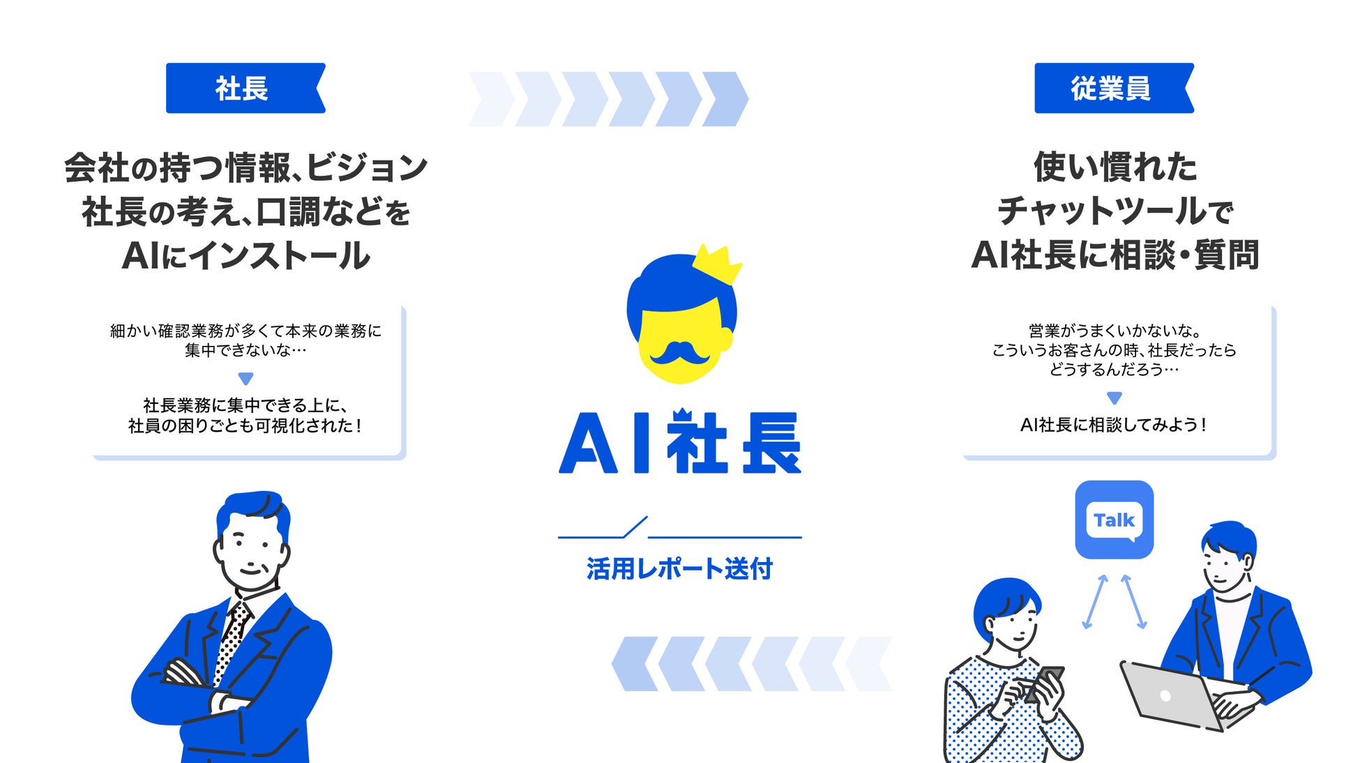 「AI社長」(https://ai-syacho.com/)は、経営者が直面する過重な業務負担とデジタル化の遅れを解決するために開発されたAIソリューションです。経営者の知識と経験をAIに実装することで、日常の判断や対応を自動化し、経営者の業務負担を軽減します。また、従業員もAIを通じて社長の知識にアクセスし、自律的に業務を遂行する能力を向上させることができます。