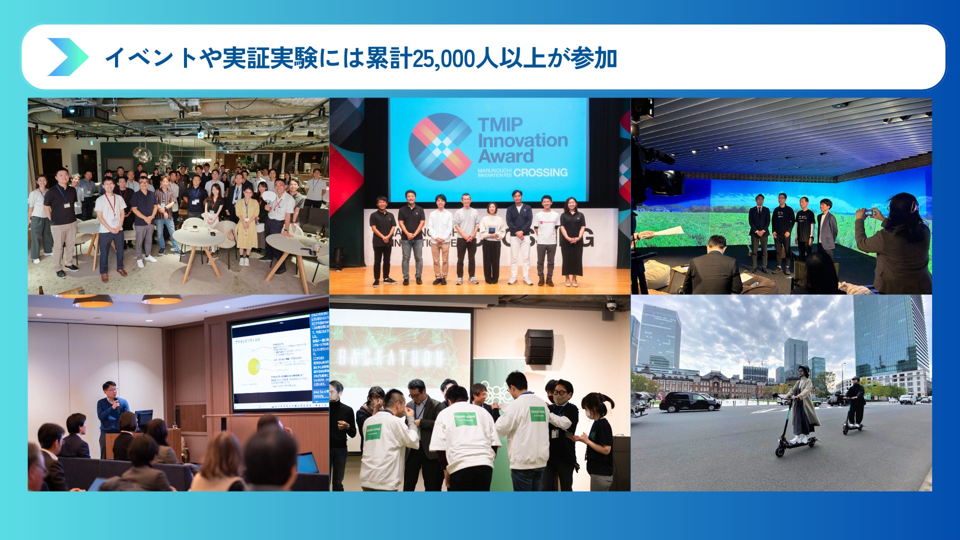 TMIPの活動にはこれまで累計25,000人以上が参加し、会員企業が抱えるさまざまな社会課題やニーズに応じてコミュニティ運営や新規事業の創出・検証・社会実装までを伴走支援してまいりました。