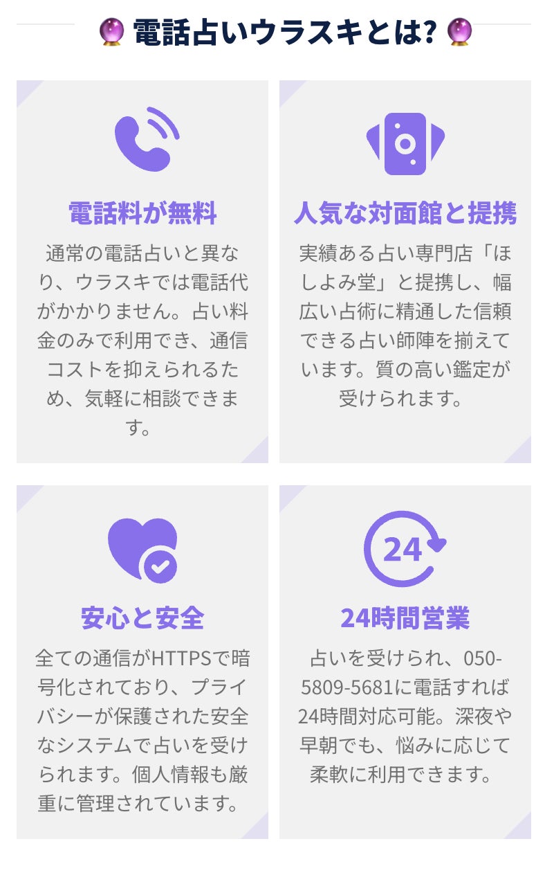 「電話占いウラスキ」は、占いを通じて人々の悩みを解決し、心の支えとなることを目指して開始した新サービスです。最新技術と信頼性を兼ね備え、誰でも簡単に利用できるオンライン占いを提供しています。