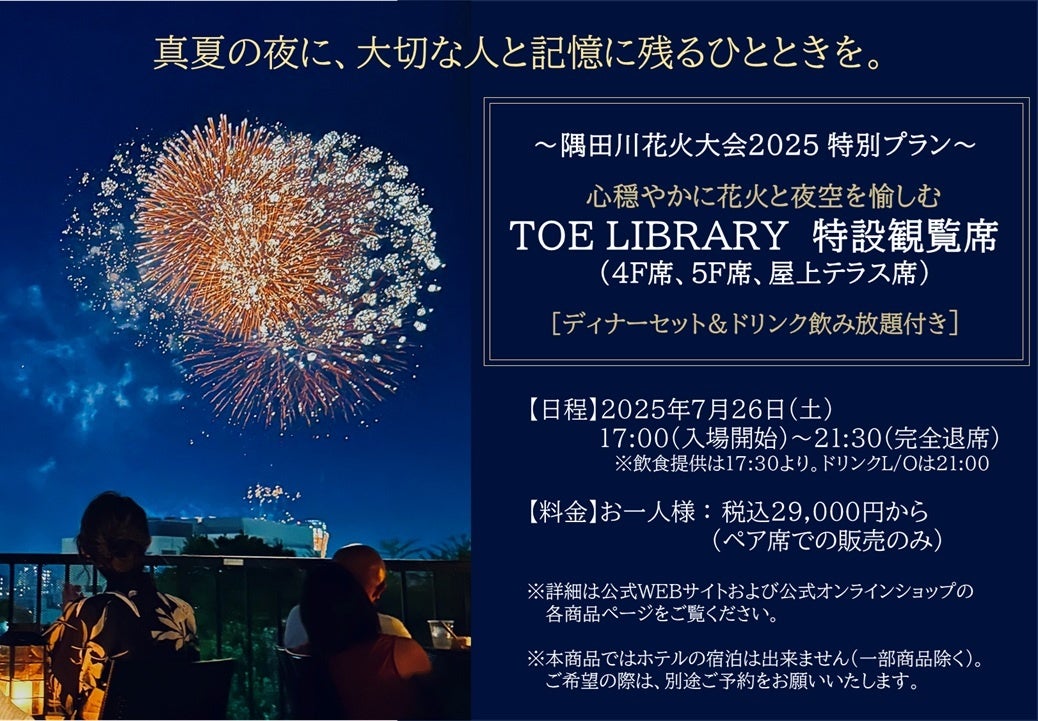ヴィンテージ家具と本に包まれたホテルを運営するTOE LIBRARY(本社:東京都台東区浅草/代表:西尾吉朗)は、2025年7月26日(土)に開催される「令和7年(第48回)隅田川花火大会」を、同施設の屋上や上層階の客室から観賞できる特別プランの予約を受け付けています。